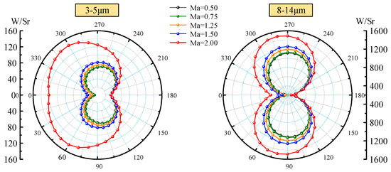 Effect of Mach number (0.5, 0.75, 1.25, 1.5, and 2.0) on IR characteristics of aircraft skin is investigated. The self-emission of aircraft skin and the BRDF reflection are comprehensively considered. The calculation time and latitude are set to 12 o ‘clock on March 21 and 0°. A detection point is taken every 10° in the XOY plane and XOZ plane, respectively. The absorptivity and emissivity of the skin surface are set as 0.8, the inlet temperature and ground temperature are both set as 278.15 K, and the emissivity and reflectance of the ground are set as 0.6 and 0.15, respectively. The different Mach number lead to different aerodynamic heating. According to Equations (18)–(20), Mach number affects the heat flux of the stagnation region, hemispheric surface, and cone surface with the non-stagnation region, and thus affects the radiation intensity distribution of aircraft. Figure 4 shows the circumferential integral radiation intensity distribution of the waveband 3−5 μm and the 8−14 μm in the XOY plane when the attack angle is 0°. Since there are no yaw and roll angles of aircraft, the radiation intensities of the two wavebands are distributed symmetrically. The radiation intensity in both wavebands increases with the Mach number. We can see that the radiation intensity of the 8−14 μm waveband is much higher than that of the 3−5 μm waveband, and its peak value is more than 10 times that of the 3−5 μm waveband. For the 3−5 μm waveband, the radiation intensity increases dramatically when the Mach number is more than 1.5, which is because of the sharp increase in the temperature of the head and the inlet. For the 8−14 μm waveband, with the increase in Mach number, the increase in radiation intensity is relatively uniform. Since the emission in this waveband mainly comes from low-temperature emission, the larger the angle of the viewable area, the larger the value of radiation intensity.
