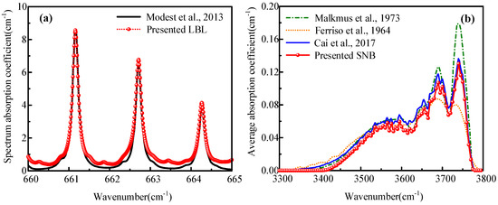 Verification of (a) LBL and (b) SNB model compared with Refs. [36,37,38,39].