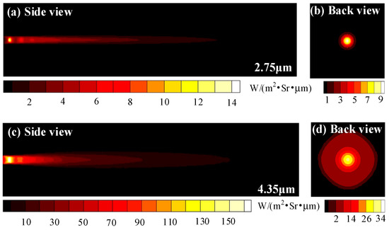 Lateral and backward spectral radiation intensity distributions of exhaust plume at (a,b) 2.75 μm and (c,d) 4.35 μm.