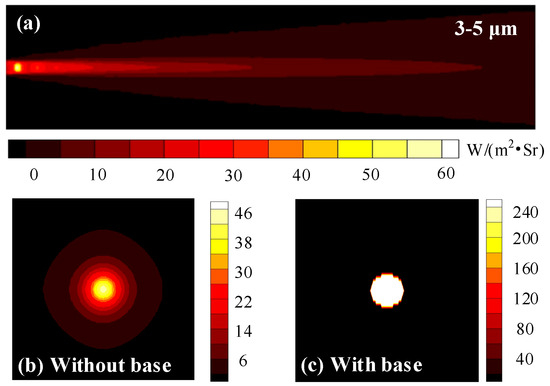 Then, we investigate the lateral and backward spectral radiation intensity distributions in the 3−5 μm waveband, which are the integration of the radiation intensity of all narrow wavebands in the 3−5 μm waveband based on the single wavelength distribution in Figure 9. We can see from Figure 10 that the radiation intensities gradually decay along the axial and radial directions. In the high-temperature region of the Mach ring at the nozzle outlet, the radiation intensity has a maximum value of 59.7793 W∙m−2∙Sr−1. Due to the effect of the Laval nozzle, the exhaust plume emerges from the nozzle outlet with a large axial velocity and almost no thermal diffusion in the radial direction. The expansion of the high-temperature airflow in the rear section of the exhaust plume leads to an increase in the radial thickness and a gradual attenuation of the temperature of the exhaust plume, both of which cause a decrease in radiation intensity. Simplifying the visible high-temperature component of the nozzle as a circular base that has the same diameter as the nozzle, backward spectral radiation intensity distributions of exhaust plumes with and without a base are investigated. It can be seen in Figure 10b,c, the existence of a high-temperature wall makes the IR signal in the backward direction much larger than that in the lateral direction.