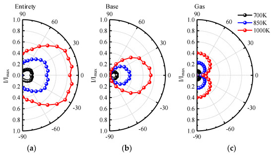 Figure 12 shows the normalized integral radiation intensity distribution for different nozzle inlet temperatures in the XOZ plane. The shielding effect of the aircraft skin on the gas radiation is not considered. We can see that the maximum radiation intensity appears at the upper and lower sides of the exhaust plume. For the integral radiation intensity distribution of entirety, when the nozzle inlet temperature is 1000 K, the maximum radiation intensity is 5.1 times the corresponding maximum value when the nozzle inlet temperature is 700 K. Therefore, in the 3−5 μm waveband, the aircraft with afterburner is an important factor affecting the gas radiation. With the increase in nozzle inlet temperature, the radiation intensity increases exponentially. In addition, at the same temperature level, the contribution of the integral radiation intensity distribution of the base is much greater than that of gas.