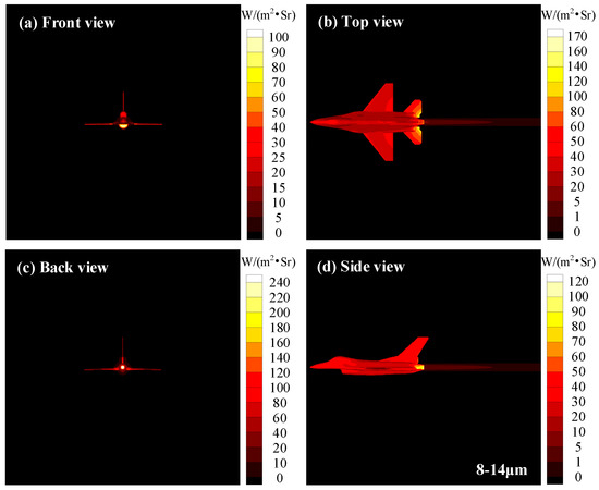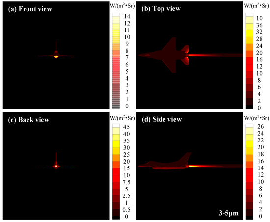 Figure 14 exhibits the infrared images of aircraft in a 3−5 μm waveband considering the radiative heating effect of the exhaust plume. The radiation intensity distribution of the front view shows that the maximum IR is located near the inlet lip, which is due to the complex aerodynamic shape in this area and, thus, the great influence of aerodynamic heating. From the back view, the nozzle region corresponds to the highest radiation intensity of 45 W∙m−2∙Sr−1, which is due to the radiation intensity superposition of the high-temperature skin and the core region of the exhaust plume under the back view. As can be seen from the top and side views, the maximum radiation intensity is not in the core area of the exhaust plume but in the skin of the nozzle and the horizontal rear wing near the nozzle because of the high temperature of these two locations, and there is neither other skin shielding nor absorption attenuation of the exhaust plume gas.