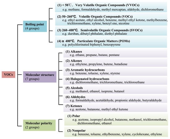 Volatile organic compounds (VOCs) in the atmosphere are a group of organic substances characterized by a low boiling point. This is defined by the United States Environmental Protection Agency (US EPA) as any carbon compound that participates in the photochemical reaction in the atmosphere, except for carbon monoxide, carbon dioxide, carbonic acid, metal carbides or carbonates, and ammonium carbonate. The World Health Organization (WHO) considers VOCs as organic compounds with a saturated vapor pressure exceeding 133.322 Pa at atmospheric pressure and a boiling point between 50 and 260 °C [1]. WHO classifies VOCs into very volatile organic compounds (VVOCs), VOCs, semi-volatile organic compounds (SVOCs), and particulate organic compounds (POMs) according to their boiling points. The World Health Organization’s (WHO) classification of VOCs according to boiling point is shown in Table 1. For molecular structure, VOCs include alkanes, alkenes, aromatic hydrocarbons, alcohols, aldehydes, ketones, and the like. In addition, polar and nonpolar VOCs are distinguished according to the degree of molecular polarity, and a detailed classification of common VOCs is shown in Figure 1.