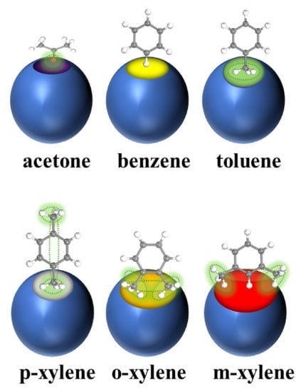 Scheme for entry of acetone, benzene, toluene, p-xylene, o-xylene, and m-xylene into UiO-67 pores [10].
