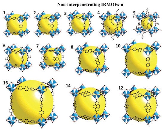 Structures of non-interpenetrating IRMOF-n (n = 1–8, 10, 12, 14, and 16) [52].