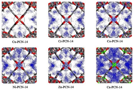 This material is a porous material formed by multiple octahedral cubic solid pore cages. Since 2006, Zhou’s Research Group [53] has successively synthesized PCN-9 and PCN-14 using a bionic method of coordinating unsaturated metal centers (UMCs) and endogenous metal centers (EMCs). The framework structure of this material contains a large number of benzene ring structures, and the pore size is conducive to methane diffusion. Studies have shown that the presence of EMCs can significantly enhance the affinity of materials for specific gases. Among them, PCN-14 has a specific surface area of 2176 m2/g and a pore volume of 0.87 cm3/g. Under the conditions of 3.5 MPa pressure and temperature of 290 K, it has excellent storage performance for methane (230 v/v), which exceeds 28% of the required standard (180 v/v) of the United States Department of Energy. The effect of metal substitution on 14CH4 storage in the PCN-14 metal–organic framework was computationally assessed by Sun et al. [54]. To investigate the effect of different metals on absorption, they modeled the 14CH4 density at the open metal sites (OMS) of M-PCN-14 at 5 Bar of methane, as shown in Figure 5. Cu had low methane adsorption, and the 14CH4 density at the OMS increased with metal substitution, corresponding to the increase in methane adsorption. In particular, Ca had a very strong interaction with 14CH4, such that the volumetric adsorption of Ca-PCN-14 was one of the highest in the M-PCN-14 series despite the low density of its framework.
