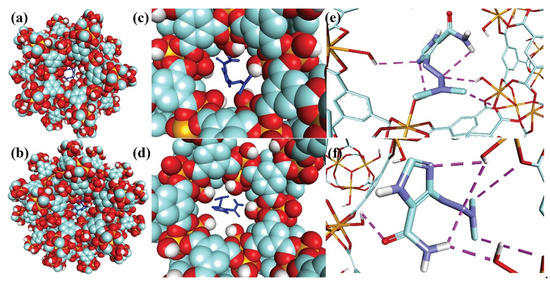 Schematic representation of the molecular docking of MIL-100(Fe) small (a,c,e) and big (b,d,f) cages with DTIC. (a,b) Full view from outside. (c,d) View from inside the cage. (d,f) Hydrogen bonds between DTIC and pentagonal window. Fe, C, O, and H colors are orange, green, red, and white in cage structures, respectively. The purple line in (c) indicates hydrogen bonding [66].