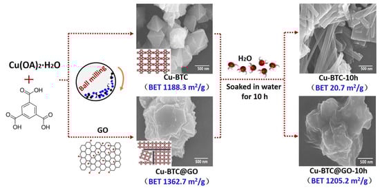 Carbon-based porous materials, including activated carbon (AC), GO, and carbon nanotubes (CNT), have excellent water resistance and structural stability. The combination of that carbon-based porous material with MOFs can not only effectively enhance the stability of the MOFs, but also provide excellent diffusion channels for gas molecules due to the abundant mesopores and macropores in the carbon-based porous material, thereby remarkably improving the gas adsorption capacity of the material. Li et al. [72] prepared AC/Cu-BTC composites by the hydrothermal method to study the adsorption performance of alkane VOCs (n-hexane) before and after water absorption. AC provided the interaction substrate for the nucleation and growth of Cu-BTC, and then affected its specific surface area parameters, resulting in the reduction of the specific surface area of AC/Cu-BTC, thus reducing its adsorption capacity. Sun et al. [73] studied the adsorption capacity of GO/Cu-BTC and RGO/Cu-BTC for different adsorbates (methane, ethane, ethylene, and propylene). The adsorption capacity of the composites for gas molecules was related to the surface properties of the graphene samples. As the surface functional groups of the materials had electrostatic repulsion and hydrophilicity, they promoted their uniform dispersion and inhibited their agglomeration behavior in the preparation process, thus increasing the specific surface area. In addition, by controlling the reduction degree of RGOs, selective adsorption of gas by the material can be achieved. Li et al. [74] synthesized Cu-BTC@GO and verified its adsorption performance for toluene. The synthesis pathways for Cu-BTC-10h and Cu-BTC@GO-10h are shown in Figure 8. The toluene adsorption capacity of Cu-BTC@GO-5 was much higher than that of traditional activated carbon and zeolite. This is due to the increase of the specific surface area of Cu-BTC@GO-5 on the one hand, and the increase of the surface dispersibility of Cu-BTC due to the introduction of GO.