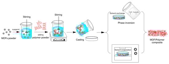 The evaporation solvent method is a synthetic method in which a mixed solution of a metal salt and an organic ligand required for the preparation of MOF is saturated by direct evaporation at room temperature to precipitate the target product as a crystal. This method has a simple and rapid synthetic process, and the reaction can be completed within a few hours. In addition, the direction of the entire reaction can be adjusted by changing the amount of solvent added in the early stage of the reaction. Guo et al. [104] dispersed the MOF powder into a solvent by mechanical stirring, and then dissolved the polymer into the MOF solution to obtain an MOF/polymer suspension. The solvent in the suspension was then evaporated by solvent evaporation, followed by precipitation of polymer and MOF to obtain MOF/polymer composite. The whole synthesis process is shown in Figure 11. The evaporative solvent method is a common method for preparing MOF/polymer mixed matrix films. However, due to the incompatibility between MOF and polymer, MOF in suspension is agglomerated, and MOF in composite is not uniformly distributed step by step.