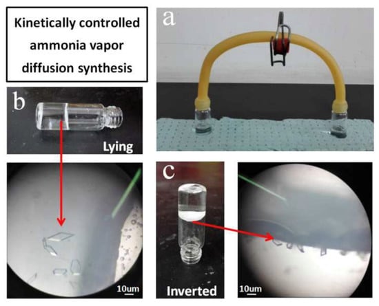 Controlled vapor diffusion synthesis of Zn(INA)2(H2O)4 at room temperature. (a) apparatus for the synthesis; the reaction mixture was in the left-hand vial, ammonia solution was in the right-hand vial. (b) the vial lying on its side, crystals on its side wall. (c) the vial inverted, crystals at the interface [105].