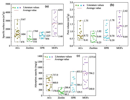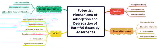 Factors that affect the efficiency of the adsorption method mainly include the characteristics of the adsorbent; the type, concentration, and nature of the adsorbed substances; and the temperature, pressure, and flow rate of the surrounding environment. As for the adsorbent, its specific surface area, porosity, and surface functional groups will affect its adsorption performance [11,12,13]. The larger the specific surface area, the smaller the pore size, and the larger the pore capacity of the adsorbent are conducive to the adsorption of VOCs and other pollutants. In addition, the design of appropriate functional groups on the surface of the adsorbent can also increase its adsorption performance, such as modification and doping [14,15,16,17,18,19]. At present, the most widely used and promising material is carbon material, which has the natural advantages of large specific surface area, abundant pore structure, large adsorption capacity, and other adsorbents, as well as the potential catalytic and surface chemical activity [11,20].