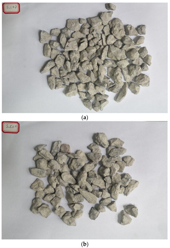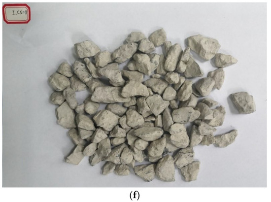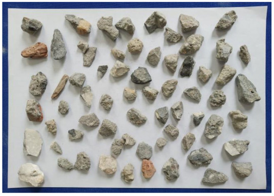 In this study, the 9.5 mm–19 mm RCA was used, which was provided by Yangzhou Huimin Renewable Resources Co., Ltd. in Yangzhou, China. The information and property of the raw concrete were unknown. There were few crushed brick aggregates in the RCA, as shown in Figure 1, and the grading curve is shown in Figure 2. The RCA was washed and air-dried before treatment and testing. By using the high-temperature calcination method, the mortar adhesive rate was about 31.2%. The main properties of the raw RCA are shown in Table 1. According to the Chinese code of Recycled coarse aggregate for concrete (GB/T 25177-2010), the grade of the RCA is also listed in Table 1. It showed that the comprehensive grade of the RCA was III, which meant the utilization would be strictly limited.