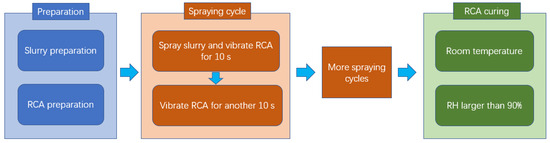Regarding the circular spraying treatment, the cement-based slurry was prepared and filled in spraying equipment, as shown in Figure 3. Then, a batch RCA of around 1.5 kg was put into the sieve, and the spraying flow rate was 5 g/s per kilogram RCA. The circular spraying treatment method contained one or more spraying treatment cycles, and one spraying cycle was conducted as follows: (a) spray cement-based slurry on the RCA for 10 s and vibrate the RCA at the same time; (b) stop spraying slurry and vibrate the RCA for another 10 s to make the RCA evenly coated. The number of the spraying treatment cycle would be determined by the slurry absorption result. After the spraying treatment, the RCA curing method was the same as the immersing treatment. The procedure of the circular spraying treatment method is shown in Figure 4, and the procedure of the experiment is shown in Figure 5.