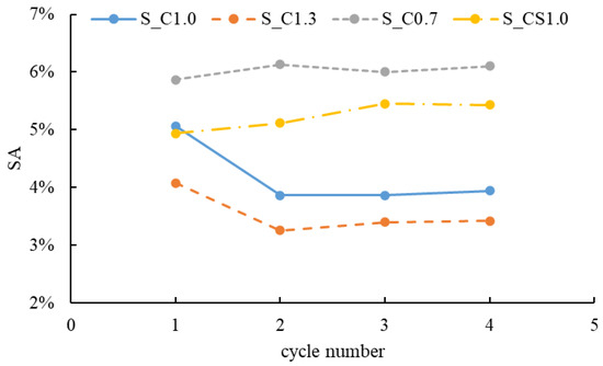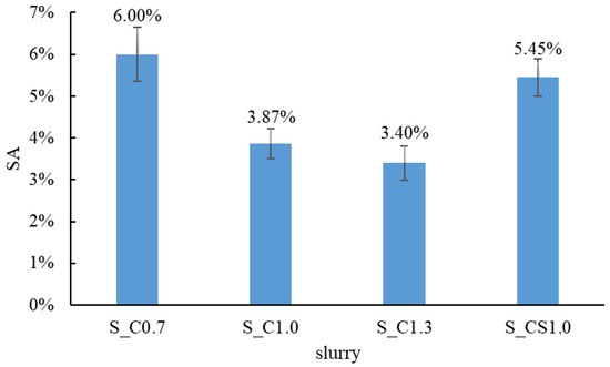When the RCA was treated with the spraying method, the mass of the slurry absorbed by the RCA during each treatment cycle was recorded, and the time-varying slurry absorption (SA) could be analyzed. The SA results of different slurries are shown in Figure 6. For S_C1.0 and S_C1.3, the SA showed a decreasing trend with the increase in the cycle number. In contrast, the SA of S_C0.7 and S_CS1.0 increased with the increase in the cycle number. In general, the order of the SA from large to small was S_C0.7, S_CS1.0, S_C1.0 and S_C1.3. The reason was that when W/B was higher, there was more water in the slurry, and the water was quickly absorbed by the RCA during the first spraying cycle. Therefore, cement particles remained on the surface of the RCA, leading to a higher concentration of the slurry. With the increase in the spraying cycle, when the lower concentration slurry was sprayed onto the surface of the RCA, less water could be absorbed by the RCA and the higher concentration slurry was diluted, and some cement particles were washed away. With the W/B decreasing, the slurry became denser and more slurry was absorbed; regarding S_CS1.0, 8% SF was incorporated, and the slurry was denser than pure cement slurry. Hence, the denser the slurry was, the more the slurry was absorbed. When the cycle number reached 3, the SA tended to be steady for all slurries. It meant that the SA did not always increase with the increase in the spraying treatment time. In this study, 1 min (3 spraying cycles) was enough, and more spraying treatment time meant waste, not only time but also material. The SA of different slurries with three spraying cycles is shown in Figure 7. From this aspect, the spraying method was more efficient than the immersing treatment, and three spraying cycles were adopted in the next tests.