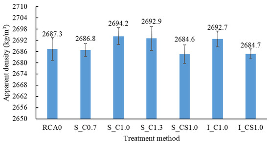 In general, regardless of the treatment method and the type of slurry, the CV of all the treated RCA was all less than that of the raw RCA, as shown in Figure 11. The CV was decreased by up to 30.0% when the spraying method was used (S_C0.7). It meant that both the spraying treatment and the immersing treatment could enhance the RCA.