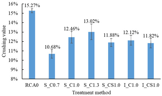 - The strength of the RCA was improved regardless of the treatment method and the W/B of the slurry. The CV decreased by up to 30% when the spraying method was used with a W/B of 0.7. When the SF was incorporated, the crushing value of the RCA could be further decreased;