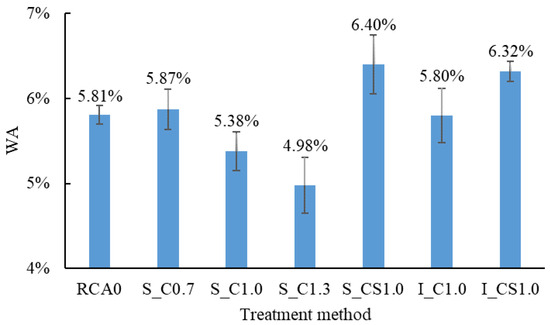 - The WA of the RCA decreased with the increase in the W/B. To decrease the WA of the RCA, the W/B should be no less than 1.0. The WA decreased by up to 14.3% when the spraying method was used with a W/B of 1.3. With the incorporation of the SF, the WA of the RCA showed an obvious increase regardless of the treatment method;