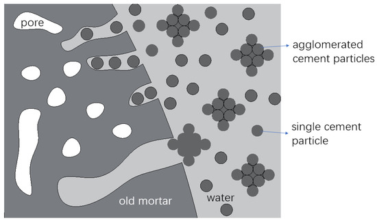 Similar results were also reported in [30]. The mechanism was discussed as follows: When the higher W/B slurry was used, there were more free water and fewer agglomerated cement particles in the slurry. Hence, more water could permeate into the old mortar, and more cement particles transmitted into the pores of the old mortar with the water [38], as shown in Figure 13. Therefore, the thickness of the strengthened old mortar would be larger, which resulted in less water permeating into the old mortar of the RCA during the WA test. Moreover, the lower W/B and the incorporation of SF could lead to a larger thickness coating [27,36]; therefore, more water was absorbed [38,39].