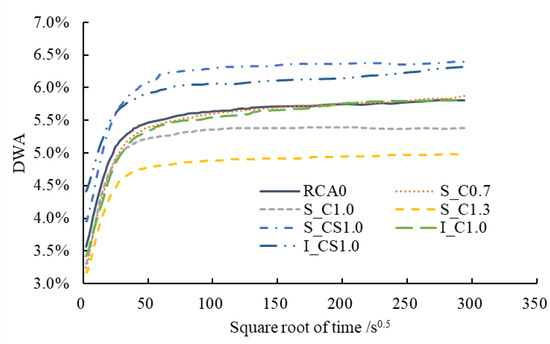 where wat is the water absorption of the RCA at time t, %; mt is the mass of the RCA immersed in water at time t, g; ms and m24 are the masses of the RCA immersed in water at time t = 0 and t = 24 h, g, respectively.