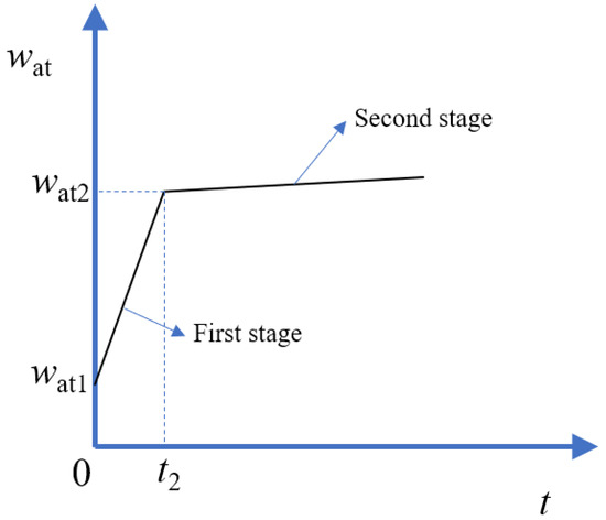 The DWA results are shown in Figure 14. The results of the first 5 s were not taken into account to avoid the influence of the artificial disturbance. According to Figure 14, the evolution of the DWA of the RCA contained two stages. At first, the water absorption increased dramatically; then, the water absorption tended to be steady. A two-stage model, which was usually adopted to analyze the evolution of water absorption of cement-based materials, could be used to depict the evolution of the DWA of the RCA [40]. During the first stage, the infiltration of water was mainly caused by capillary pores (the radius was less than 10 μm), and the water absorption rate was faster [41]. During the second stage, the infiltration of water was mainly caused by blowholes (the radius was larger than 10 μm), and the water absorption rate was also slowed down. Figure 15 shows the schematic of the two-stage model. Based on the two-stage model, two straight lines were used to fit the two stages, and the functions are listed in Table 5. The influence of the bubbles was eliminated by shaking the RCA at the beginning of the test, and the data were recorded after 5 s. The evolution of the DWA was not recorded during the first 5 s; therefore, at the very beginning of the first stage, the water absorption was not equal to 0. By extending the straight line of the first stage to the vertical axis, the water absorption at the very beginning of the test was determined, as shown in Table 5, and the saturation degree (SD1 = wat1/WA) was also calculated. It could be found that once the RCA was put into water, the saturation degree exceeded 50% immediately. The duration of the first stage, t2, was about 9–15 min. At the end of the first stage, the saturation degree (SD2 = wat2/WA) exceeded 90%. Similar results were also reported in [42,43]. It meant that the evolution of the DWA was not changed when the RCA was treated with cement-based slurry.