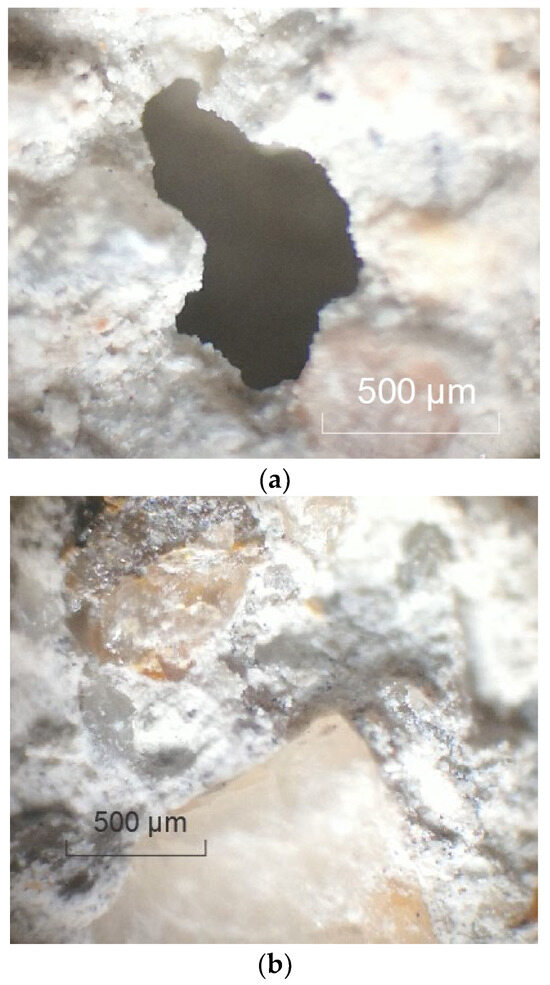 Images of the raw RCA obtained with optical microscope (magnification: 40). (a) Pore; (b) adhered mortar.
