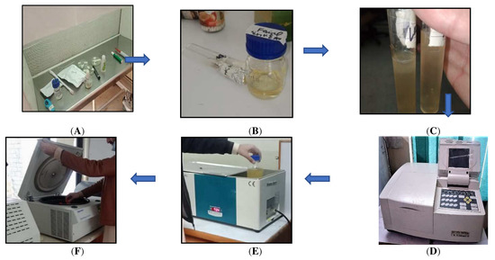 Process of obtaining bacterial spores. (A) Laminar flow preparation of nutrient broth; (B) bacterial growth medium nutrient broth; (C) shaking incubation growth; (D) spectrophotometer colony counter; (E) water Bath for growth inactivation; (F) centrifugation for obtaining bacterial spores.