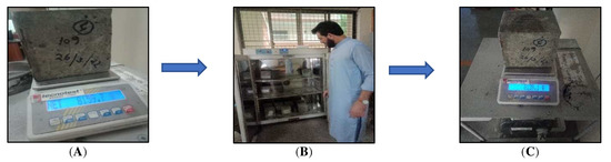 A slump test was performed to determine the consistency and workability of the cement concrete. A concrete is determined to be viable if it can be simply mixed, placed, compacted, and finished. A viable concrete should not show any segregation or damage. The control concrete and microorganism concrete mixtures were designed to have a slump of 25–75 mm. For the microorganism concrete mixture, cell concentrations of 103, 106, and 109 cells of Bacillus subtilis per milliliter of water were used. Concrete cube specimens 150 mm × 150 mm × 150 mm in size were hardened to develop a 28-day compressive strength of 20 MPa. At 28 days, the specimens were tested for compressive strength using a compression testing machine. Avoiding any shocks, loads were applied at an increasing rate of approximately 140 kg/cm2/min until the specimen could not sustain the load. The maximum load was recorded, and the compressive strength was calculated by dividing the maximum load by the size of the cross-sectional area. This test was conducted on four specimens and the average value was taken. The test was conducted as per ASTMC 642-97 to work out the inflated resistance to water penetration in the concrete. The control and bacterial concretes were cast in cubic molds 150 mm in size. The square specimens were cured for 28 days. To determine the water absorption percentage for both the control and bacterial concrete, the specimens were placed in a water tank and cured for 28 days. For the bacterial concrete samples with varying concentrations of encapsulated IONP bacteria, both the pre-cracking and post-cracking wet weights were recorded using a scale, as shown in Figure 5. Then they were placed in an oven and dried at 35 ± 5 °C for 12 h. The water absorption of the specimens was calculated before drying and after drying for both the control specimens and bio-concrete samples with encapsulated iron oxide nanoparticles with varying concentrations of bacterial cells, i.e., 103, 106, and 109 cells/mL of potable water.