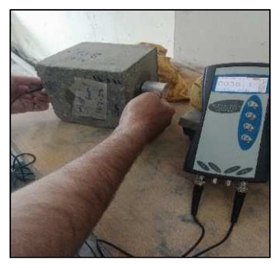 The ultra-sonic pulse velocity test as shown in Figure 6 was performed on both the control specimens and bio-concrete samples to detect the internal defects within the concrete matrix.