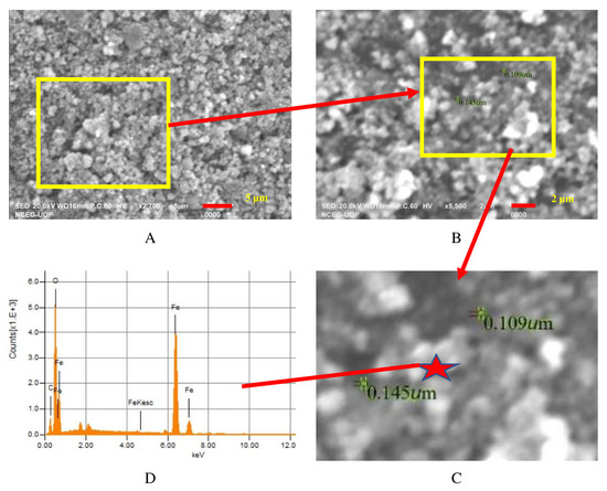 The SEM analysis shows that the IONPs particles were small porous particles, rounded and spherical, as shown in Figure 7. In addition, the SEM images show that the synthesized IONPs were uniformly distributed and no agglomerates were seen. The porosity in the IONPs reflected in the morphological analysis is best suited for bacteria encapsulated in concrete. Magnetic nanoparticles with surface grafting may be readily diffused in water to generate a homogenous suspension. Similar SEM results can be found in the literature for synthesized IONPs [33]. The EDX spectra revealed significant Fe and O peaks. In the Fe3O4 compositional components generated through co-precipitation synthesis, the Fe had a value of 53.80%, while the O had a value of 32.30%. These data show that the synthesis products and samples were pure and had excellent stoichiometry. The SEM-EDX showing an FeO percentage of 89.55% (calculated quantitively from the microscale) reflect that the sample was pure, and no other impurity peaks were observed, as shown in Figure 7D. Similar results can be found in the literature [34].