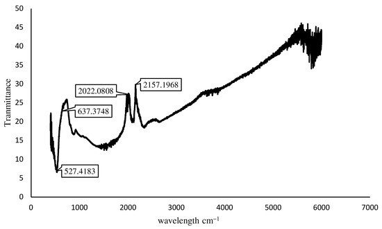 It can be seen in the FTIR spectra of the prepared Fe3O4 nanoparticles that the characteristic absorptions of the Fe-O bond are at 530 cm−1 and 634 cm−1. Both the peaks at 530 cm−1 and 628 cm−1 in Figure 8 confirm the existence of the Fe-O bond. The characteristic peak of 2157 cm−1 confirms the existence of carbon. The results in the literature [35] also confirm these results for Fe3O4 nanoparticles.