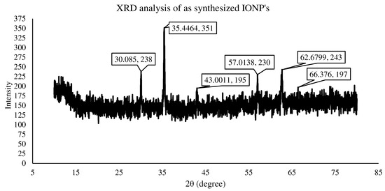 The crystalline phases of the products were determined using XRD measurements. The Fe3O4 samples displayed six typical peaks at values of 30, 35.4, 43, 57, 62.67, and 66.37, which correspond to the (238), (351), (195), (230), (243), and (197) crystal planes, as can be seen in Figure 9. No more peaks occurred, suggesting the development of a clean and single phase devoid of impurities left over from the unreacted precursors of the production of other phases, such as Fe3O4 or Fe. Furthermore, the peaks are quite wide, indicating the creation of very tiny particles in the nano-scale region [36]. The average crystallite sizes (d), as determined by the Debye–Scherer equation d = Kλ/(cosθ), were around (a) 12.6 nm, (b) 13.4 nm, (c) 14.2 nm, and (d) 13.8 nm. The XRD pattern indicates that the Fe3O4 nanoparticles had a spinal structure with no distinctive impurity peak. Similar findings were discovered in the literature [34,35].