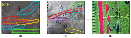 Crack healing of bio-concrete; (BC-3) (A) crack healing of 1.34 mm; (B) digitized image of healed crack; (C) crack healing of bio-concrete; (D) (BC-6) crack healing of 1.47 mm; (E) digitized image of healed crack; (F) crack healing of 0.97 mm; (G) crack healed length (C-16) 5.3″; (H) crack healed length (C-13) 3.5″ (I) digitized image of healed crack; (J) cracking of BC-9; (K) crack healed; (L) crack healed width (C-4) 1.71 mm.
