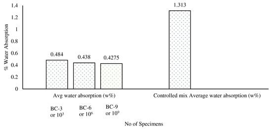 The results show (Figure 13) that the average water absorption decreased with increases in the concentration of the bacterial load in the bio-concrete. Overall, BC-9 showed 68% less water absorption compared to the control specimen. This is due to the fact that an increase in the bacterial load caused more calcium carbonate to be produced by the microbes, which blocked the pores and increased the concrete’s durability.