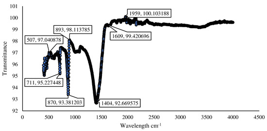 The FTIR analysis of microbially produced calcium carbonate in powder appears to be a useful approach for early identification, as shown in Figure 17. Calcite was the most abundant mineral generated by Bacillus subtilis cells (as determined by the intensity values of the bands at 873 cm−1 and 1800 to 1550 cm−1). The white precipitate deposited by Bacillus subtilis produced extremely distinctive acute stretching bands of calcites from 1800 to 1550 cm−1 [39,40].
