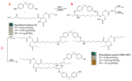 The process was performed using epoxidized soybean oil, bisphenol A, and LiCl (in an amount of 0.002 mol per 1 mol of OH groups). The process was conducted according to a previously described procedure [45] and resulted in a polyaddition product—ESBO_BPA—which was subjected to an analysis of its contents of epoxy and hydroxy groups using both titration and FT-IR methods.