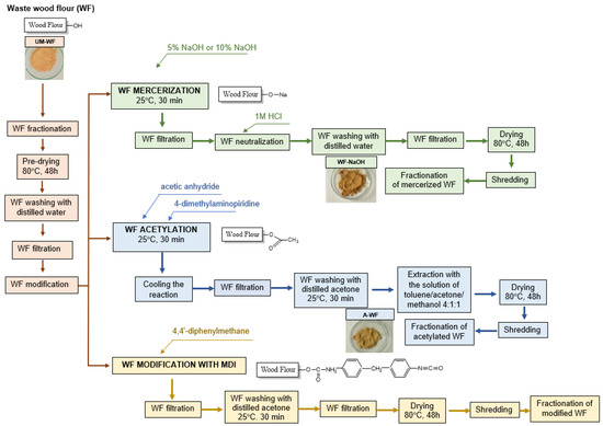 A laboratory shaker for sieve analysis was used for the separation of waste received from the producer into homogeneous fractions, resulting in the obtainment of seven different medium dimensions of wood flour particles: >0.2 mm, 0.2–0.16 mm, 0.16–0.1 mm, 0.1–0.076 mm, 0.076–0.056 mm, 0.056–0.04 mm, and <0.04 mm. For the studies described within this manuscript, a fraction with a size <0.04 mm was used. Before its further application as a component of epoxy composites, the wood flour was predried at a temperature of 80 °C for 48 h and subjected to mercerization (1) and acetylation (2).