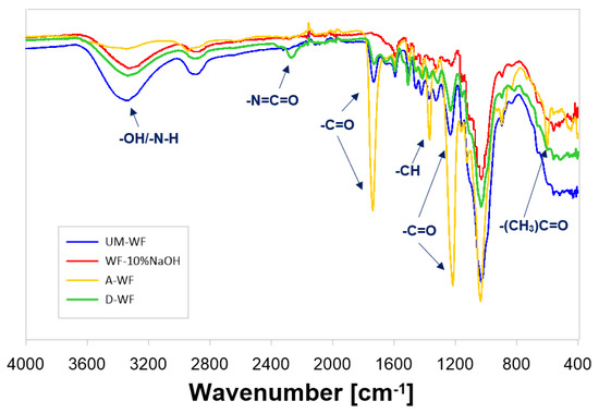Figure 3. FT-IR spectrum of unmodified and chemically modified waste oak flour (UM-WF—unmodified wood flour; WF-10%NaOH—wood flour mercerized using 10% solution of NaOH; A-WF—acetylated wood flour; D-WF—wood flour modified with MDI).