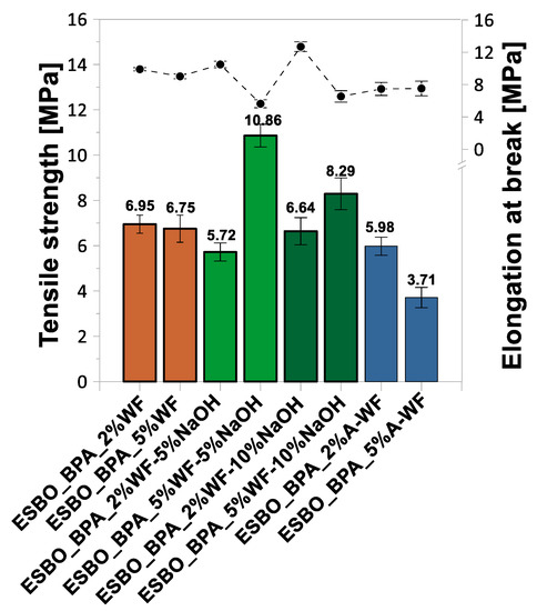 Figure 5. Tensile strength and elongation at break of compositions based on ESBO_BPA filled with waste oak flour.