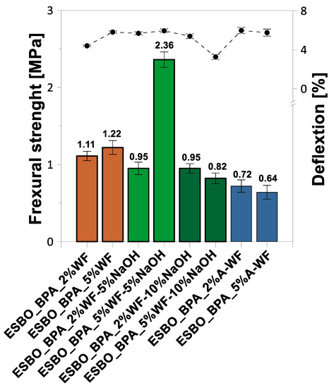 Figure 6. Flexural strength and deflection of compositions based on ESBO_BPA filled with waste oak flour.