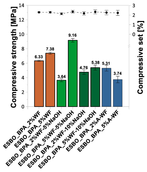 Figure 7. Compressive strength and compression set of compositions based on ESBO_BPA filled with waste oak flour.