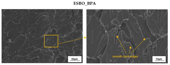 Based on the SEM analysis (Figure 8) performed on the surfaces of the impact fractures of pure cross-linked epoxy-polyurethane compositions, we found that the cured ESBO_BPA material was characterized by a homogeneous structure without any phase separation, which is typical for samples of cross-linked epoxy materials with the addition of vegetable oils as reactive diluents [58].