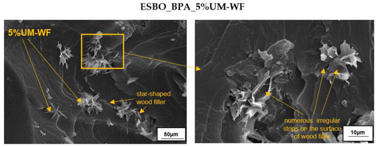 In the case of such materials, oil microdomains that were evenly dispersed throughout the sample were observed. Theoretically, in the case of epoxy–polyurethane materials, which were the subject of the present research, the phenomenon of phase separation may occur, due to both the different polarity of the fusion product macromolecules and bisphenol A as well as the different reactivity of the secondary hydroxyl and phenolic groups. However, as indicated above, based on the performed SEM analysis, no such phase separation in the case of the pure ESBO_BPA was observed. Additionally, it is worth mentioning that the obtained epoxy–polyurethane compositions also did not show brittle cracks, which are typical for epoxy materials based on petrochemical raw materials. In turn, the SEM microphotographs of biocomposites filled with the unmodified oak filler (Figure 9) revealed agglomerates of the biofiller that were unevenly distributed throughout the composition. Simultaneously, the biofiller particles were characterized by an interesting star shape. The agglomeration of the biofiller might be explained by its poor interfacial affinity, resulting in the lower values for the mechanical properties recorded for the ESBO_BPA-UM-WF samples.