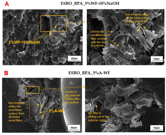 Figure 10. SEM micrographs of the impact fracture surfaces of the crosslinked samples of (A) ESBO_BPA composition filled with 5 wt % of wood flour mercerized using a 10% solution of NaOH and (B) ESBO_BPA composition filled with 5 wt % of acetylated wood flour.