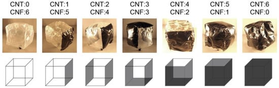 The obtained square films were patched together to form a development of regular hexahedral. When patching films together, a strong bond can be achieved by locally soaking the joint area with deionized water and allowing it to dry at room temperature (RT) of approximately 25 °C. Figure 1 shows photographs and illustrations of the fabricated balloons, in which the number of CNT planes and CNF planes was varied. The length of one side of the cube was approximately 8 cm. The weight of the balloon (total weight of the film and the mass of the air inside) was approximately 0.25 g.