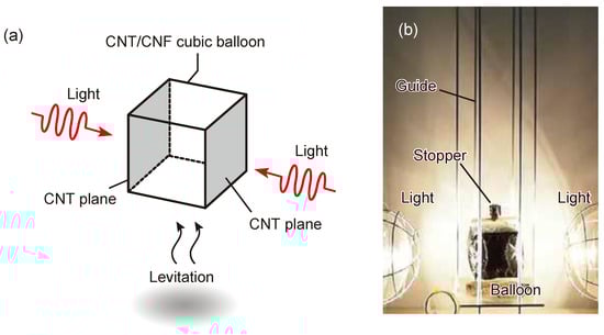 Indoor drones are expected to be used to monitor the sick and elderly in hospitals, observe the growth of crops in greenhouses, and inspect factories [1,2,3]. In order to fly in confined small indoor spaces where people and precision apparatus are present, it is necessary to realize small, lightweight, soundless, and windless flying objects. Therefore, we believe that small balloon-type flying objects are more suitable for this purpose rather than multi-rotor or fixed-wing flying objects [4,5]. We have developed the first flying balloons composed of carbon nanotube (CNT) freestanding films in the world [6]. Because CNTs have extraordinary physical properties, such as being lightweight, high heat resistance, and high electromagnetic wave absorbent [4,7,8,9,10,11,12], the air temperature inside the paper balloons composed of CNT freestanding films increases rapidly by light irradiation. As a result, the balloon can be levitated without any sound or wind.