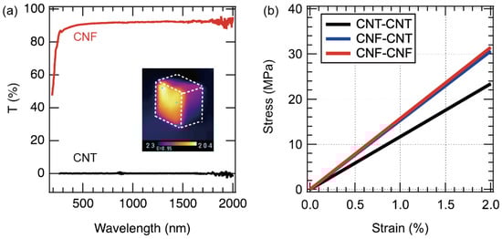 (a) Optical properties of CNF and CNT freestanding films. Inset is a thermograph of CNT balloon during light irradiation. (b) Mechanical properties of film-to-film junctions.