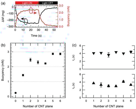 (a) Time evolutions of the mass change and buoyancy force of the balloon (number of CNT planes is 3) during the light irradiation. (b) Buoyancies of CNT/CNF hybrid balloons as a function of number of CNT planes. (c) Rise and decay time constant of the buoyancies as a function of number of CNT planes.