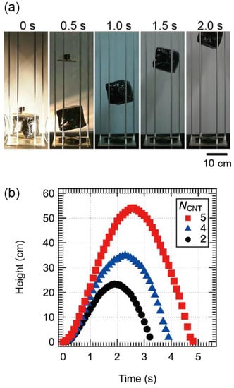 Next, we investigated the levitation characteristics of the CNT/CNF balloon. Figure 5a shows photographs of a CNT/CNF balloon with NCNT = 5 during levitation. The left figure shows the snapshot when the stopper was released after 30 s of light irradiation with the stopper in place. The subsequent photographs of the balloon were taken every 0.5 s. We confirmed that the balloon rose about 48 cm in about 2 s.