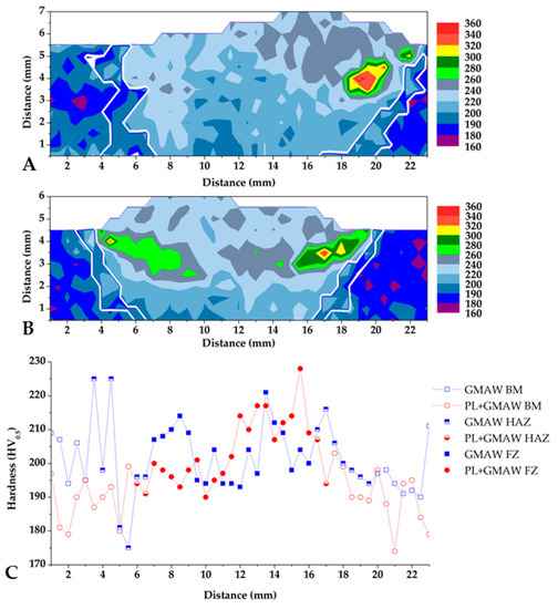 - The weld seams produced with GMAW and PL + GMAW displayed similar macrostructure characteristics; however, the HAZ of the arc condition was larger. The depth of laser influence was about 1 mm.