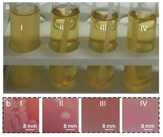 Analysis of microbiological purity of cotton fabric samples: (a) test tubes with agar after incubation, (b) photographs of the agar from the test tubes after incubation. Fabric sample not disinfected (I), fabric samples disinfected with 0.8% of OXONE (II); 0.2% TBA-OXONE (III); IV 0.4% TBA-OXONE (IV).